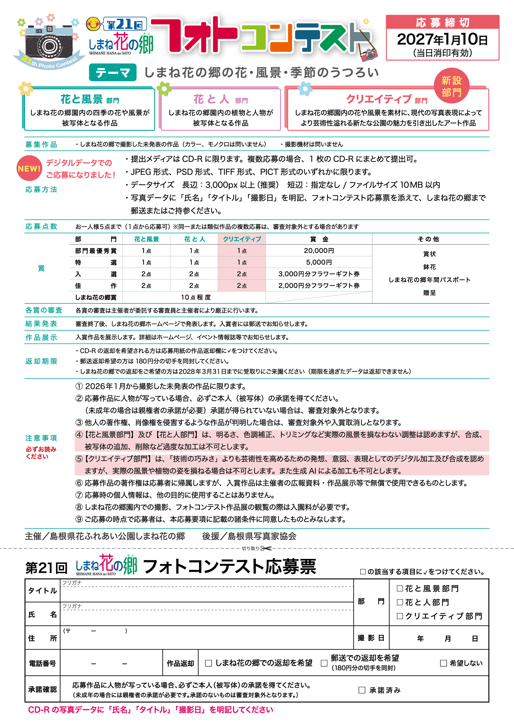 ・写真データに「氏名」「タイトル」「撮影日」を明記、フォトコンテスト応募票を添えて、しまね花の郷まで郵送またはご持参ください。